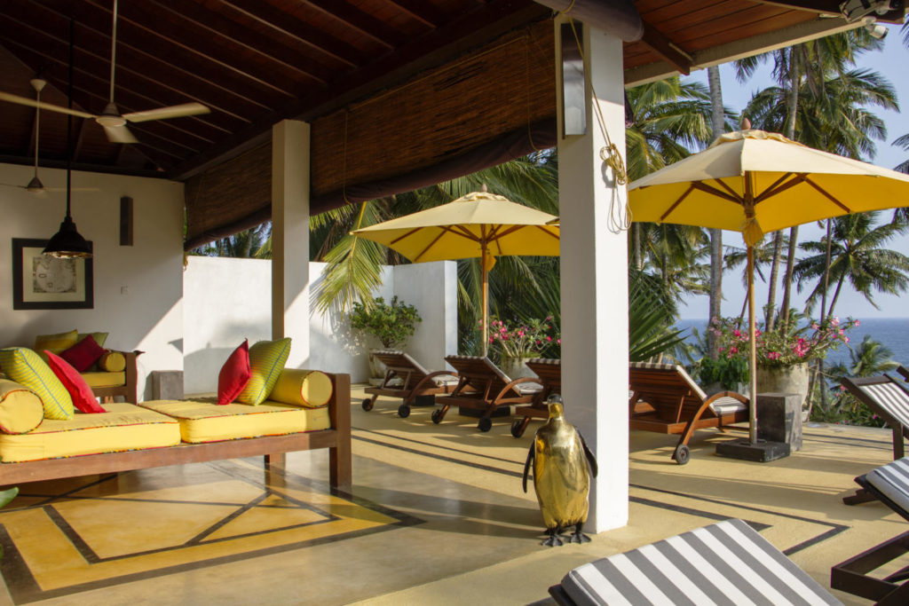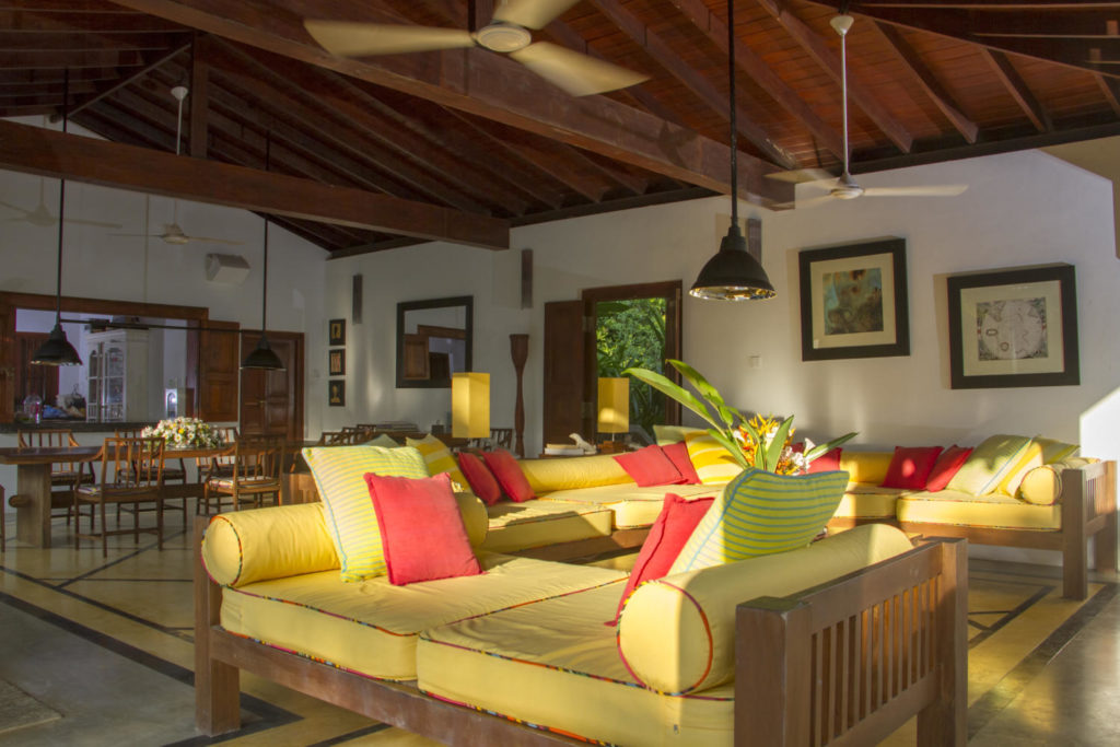 The bedrooms are cool and airy, with polished concrete floors and contemporary furniture, hand-built from local teak and mango. Thick 12″ mattresses and fine linen lie on striking, under-lit polished concrete beds topped with huge mosquito nets. Each room has a selection of thick white towels, coloured beach towels and lots of flowers.